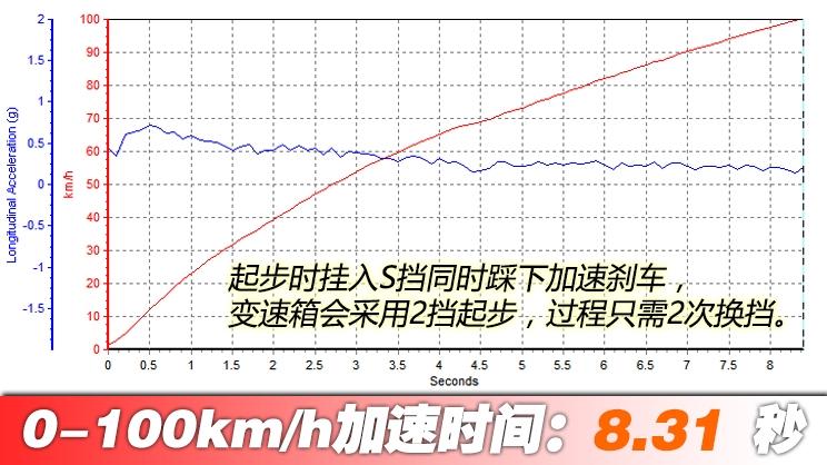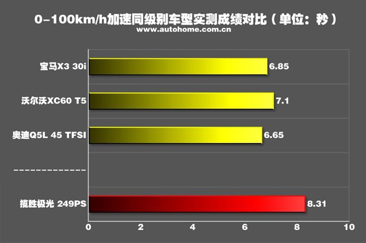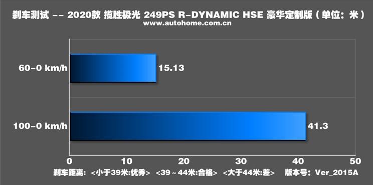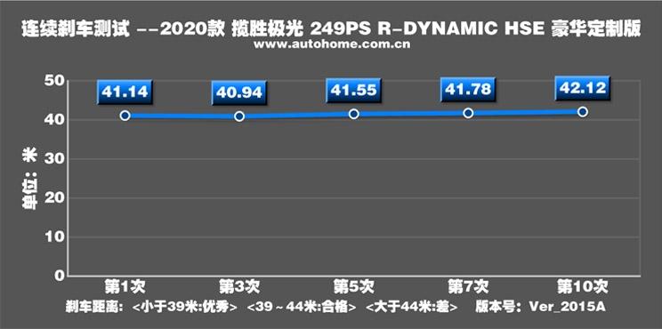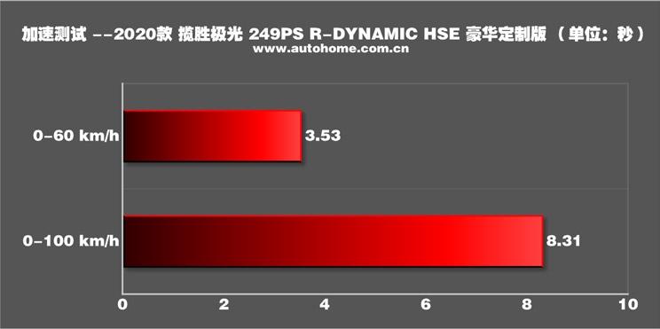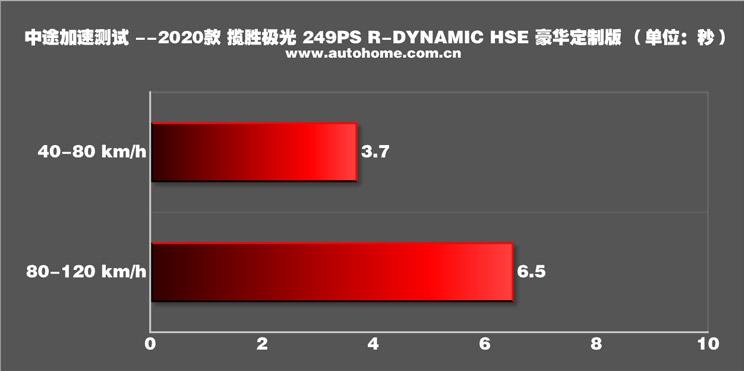 加速一个比较有意思的是全新极光切换到运动模式同时踩下油门和刹车,会自动切换到2挡起步,它能够在4挡时候破百。第二次测试没有使用运动模式,在1挡起步时依旧是4挡破百,换两次挡的加速成绩要比三次挡快不少,看来路虎的工程师用损失一定的起步动力带来加速的提升。从和竞品的对比成绩来看它没有什么优势,但是它是这四台车中唯一一个测试过的国六车型。