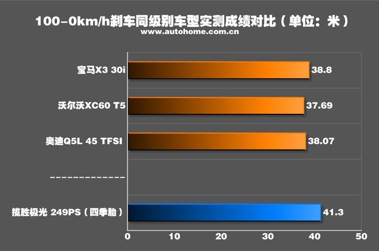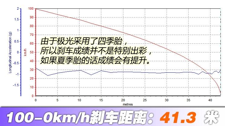 因为极光使用了四季胎,干地刹车性能没有同级使用普通夏季胎的车型表现好,刹车的成绩在41.3米,不过四季胎对于湿滑路面和烂路性能会比普通夏季胎要好,也更适应雨雪天气,41.3米的刹车成绩在城市中也不会处于危险之中,购买的消费者没有必要为其更换夏季胎。