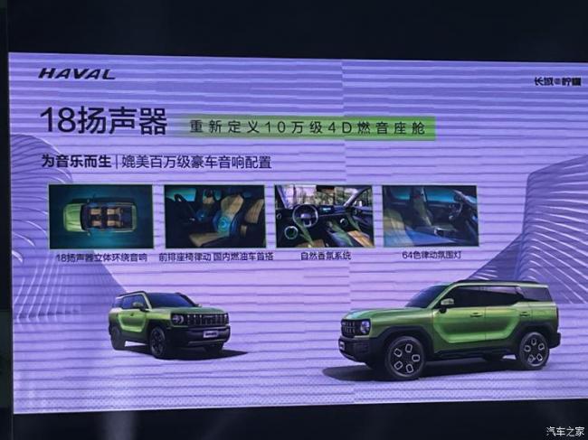 内饰方面,新车整体采用了简约的设计风格,平直的中控台线条,搭配三辐式多功能方向盘、大尺寸中控液晶屏以及双拼色的座椅配色,让新车看上去更加时尚。同时,该车采用了与坦克300车型相似的挡杆设计,具有较强的力量感。配置方面,根据现场公布的PPT来看,新车根据配置不同将提供18枚扬声器、前排座椅律动、香氛系统以及64色律动氛围灯等,从而提升驾乘感受。