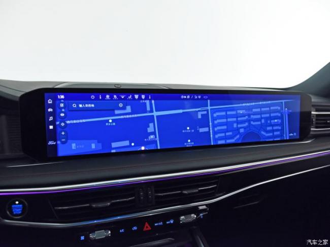 27英寸的大横屏幕,让中控屏与副驾驶屏连为一体,这在量产车型里并不多见。其采用福特SYNC+2.0智行互联车机系统,拥有爱奇艺、QQ音乐、喜马拉雅等海量娱乐与生活服务App,4032*756高清分辨率。其使用导航模式时,可以将整个横屏作为地图展现,同时,也可以让中控屏与副驾驶屏分区显示内容。不过,由于主驾驶座位人员无法触及到副驾驶一侧屏幕,因此多数时候,副驾驶屏的呈现内容仍然有限。