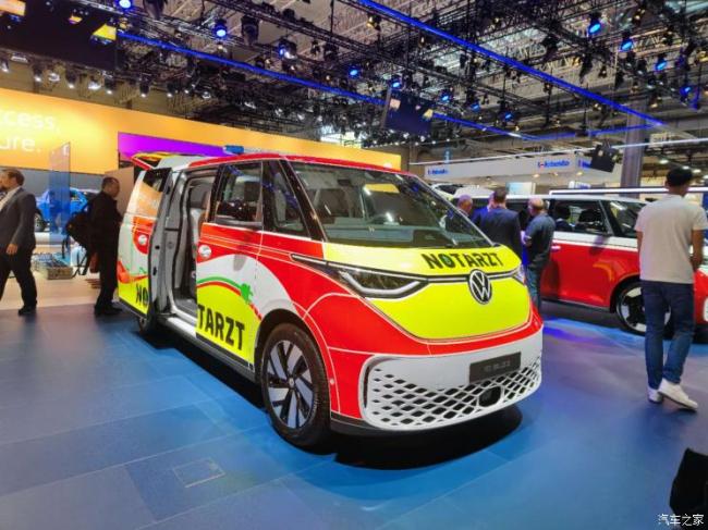 [本站 新车首发] 在汉诺威商用车展上,大众ID. Buzz救护车首发,新车基于大众ID. Buzz打造,拥有特别的涂装以及一个救护车用的车顶灯条。