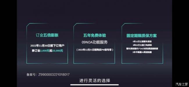 [本站 新车上市] 2022年10月23日,领克09 EM-P远航版迎来正式上市,新车共推出2款车型,售价区间为35.58-36.58万元。值得一提的是,2022年11月30日前下订并选择固定期限质保方案后,领克09 EM-P远航版领享权益价,AM版车型的售价为33.98万元,PM版车型的售价为34.98万元。新车不仅在续航里程方面有着出色的表现,WLTC/CLTC综合续航里程分别可以达到1100公里/1430公里;在性能层面更是展现出了相当强的实力,满油满电的情况下,新车的0-100km/h加速时间仅为5.9秒。购车权益方面,2022年11月30日前下订的用户可以享受订金2000元抵10000元;2022年12月31日前购买PM版本的用户可以享受NOA功能五年免费体验;此外,新车还将提供固定期限质保方案,包括5年10万公里整车质保、8年20万公里三电质保、整车质保期内7*24小时免费道路救援、5年不限量5G高速流量等。此外,领克App下订通道在2022年10月23日20:19开启,新车将会在2022年11月1日开启交付。新车的详细售价如下表: