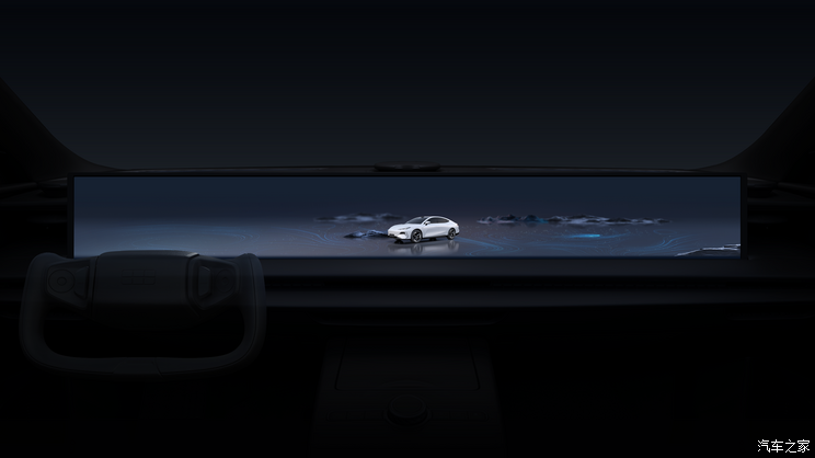 我们对官方的预告图进行了处理(下图),可以看到更多的细节。新车车内会采用十分简洁的设计,中控台上方只保留了45英寸的8K屏幕,官方表示这块屏幕有效显示区域尺寸达到了1130mm*138mm,它的黑边为8mm,屏占比达到98%,厚度为9.8mm。此外,在P挡状态下,它还支持手机或者手柄直连来打游戏。