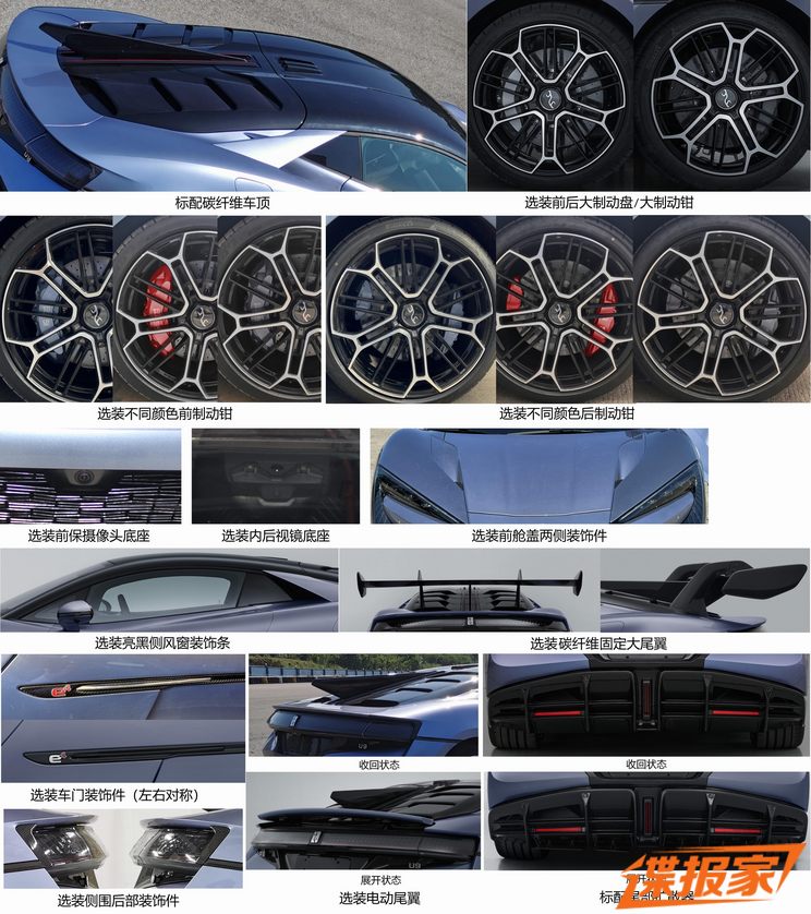 申报图与此前展示的版本一致,该车整车的设计富有攻击性,车头部分线条冲击力极强,C字灯组让它具有很强的辨识度。该车标配碳纤维组件,车尾还可以选装大型碳纤维固定式扰流板,“GT感”拉满。