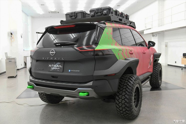 外观来看,该车基于日产奇骏打造而来,针对越野性能进行了大幅升级改造,并采用了十分鲜艳的粉色+绿色涂装。车头配备了全新的越野风格下包围,接近角大幅提升,并配备了银色护板防止车头磕碰。车头两侧配备了粉色的拖车钩,车顶还配备了一排灯组,能够在尘土飞扬的野外环境提供充足照明。