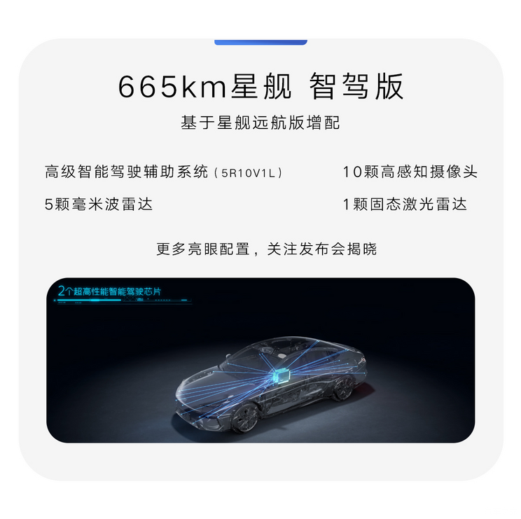 吉利银河E8的两款高配版车型665km星舰智驾版与620km星舰性能版,均在665km星舰远航版有所增配,分别实现了智能进阶、性能进阶。其中665km星舰智驾版增加了5R10V1L高级智能驾驶辅助系统,包括5颗毫米波雷达、10颗高感知摄像头、1颗固态激光雷达。620km星舰性能版基于全栈800V超高压平台打造,采用了165kW前感应异步电机+310kW后高性能永磁同步电机,最高充电功率360kW,轮圈也升级成20寸运动轮圈,0-100km/h加速时间仅需3.49s。