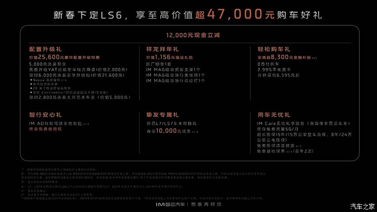 除了1.2万元的购车现金优惠外,“龙年新春购车权益”还包括选装配置优惠、精品礼包以及金融优惠等。对于增换购用户还可以再享受1万元减免。此外,在新春期间下定LS6还能够享受到IM AD智能驾驶全功能包的终身免费使用权以及终身免费流量等权益。