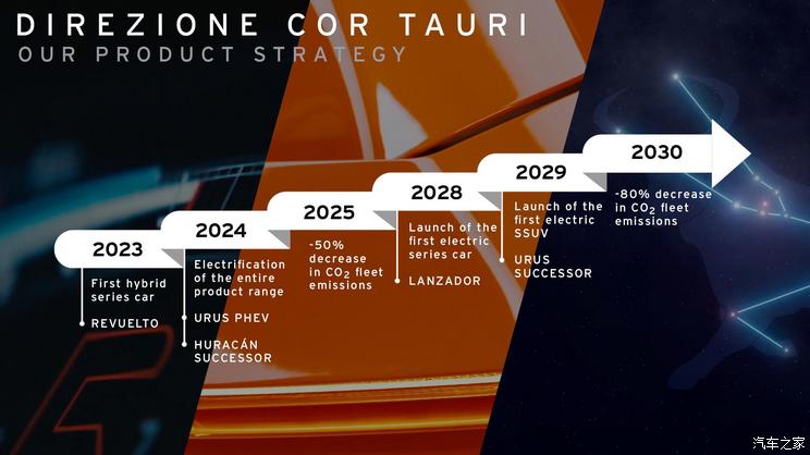 2021年首次宣布的“向金牛座之心前进(Direzione Cor Tauri)” 电动化规划启动了兰博基尼汽车公司针对电动化带来的机遇与挑战所进行的深入且持续的研究,并凭借2023年推出的首款HPEV(High Performance Electrified Vehicle)高性能混合动力超级跑车Revuelto开启混动化阶段。