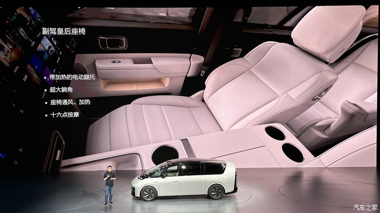 二排的独立座椅就更加强大了,16点按摩、270度环抱加热(包含扶手、腿托、靠背、坐垫)、座椅通风、50W无线通风快充这些功能均有。官方数据显示,它的坐垫长度为530mm,靠背高度为613mm,靠背角度可以做到70度躺平,腿托调节角度可以达到78度。在安装了两个独立座椅后,该车中央通道的宽度还有160mm,对第三排乘客进出相对友好。