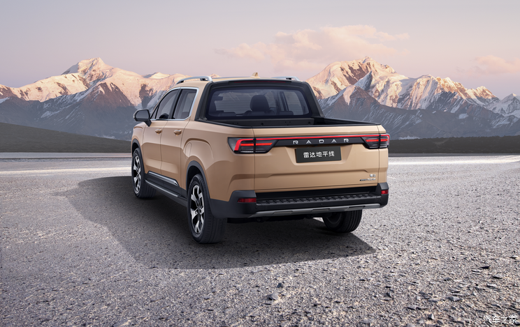 外观上看,雷达地平线整体延续了雷达RD6的造型设计,对外观细节进行调整,其中车标英文字母从发动机盖移动到前格栅位置,并且字母被进一步放大。车尾增加“4WD”标识,以此凸显四驱版身份。尺寸方面,新车车身长宽高分别为5260*1900*1880mm,轴距达到3120mm。货箱的长宽高分别为1525*1450*540mm,车载空间可达1200L。