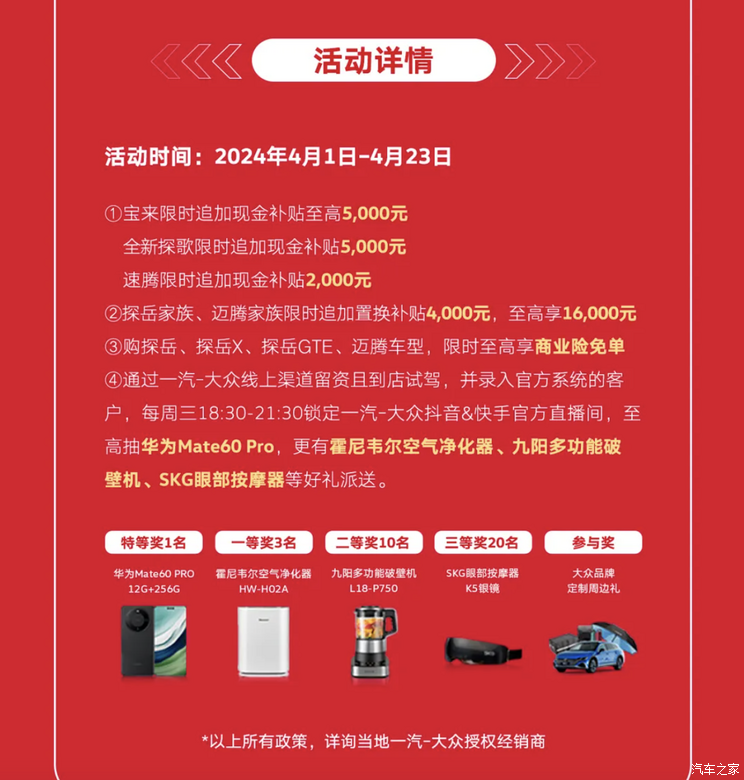 [本站 资讯] 4月1日,一汽-大众官方表示,在4月1日-4月23日期间开启限时追加补贴大放送活动。官方表示,全系限时追加现金补贴至高5000元;全系限时追加置换补贴至高4000元;全系限时享置换补贴至高24000元;探岳家族、迈腾至高享商业险免单;报废车限时享同等力度置换补贴;首次到店试驾至高抽华为Mate60 Pro。