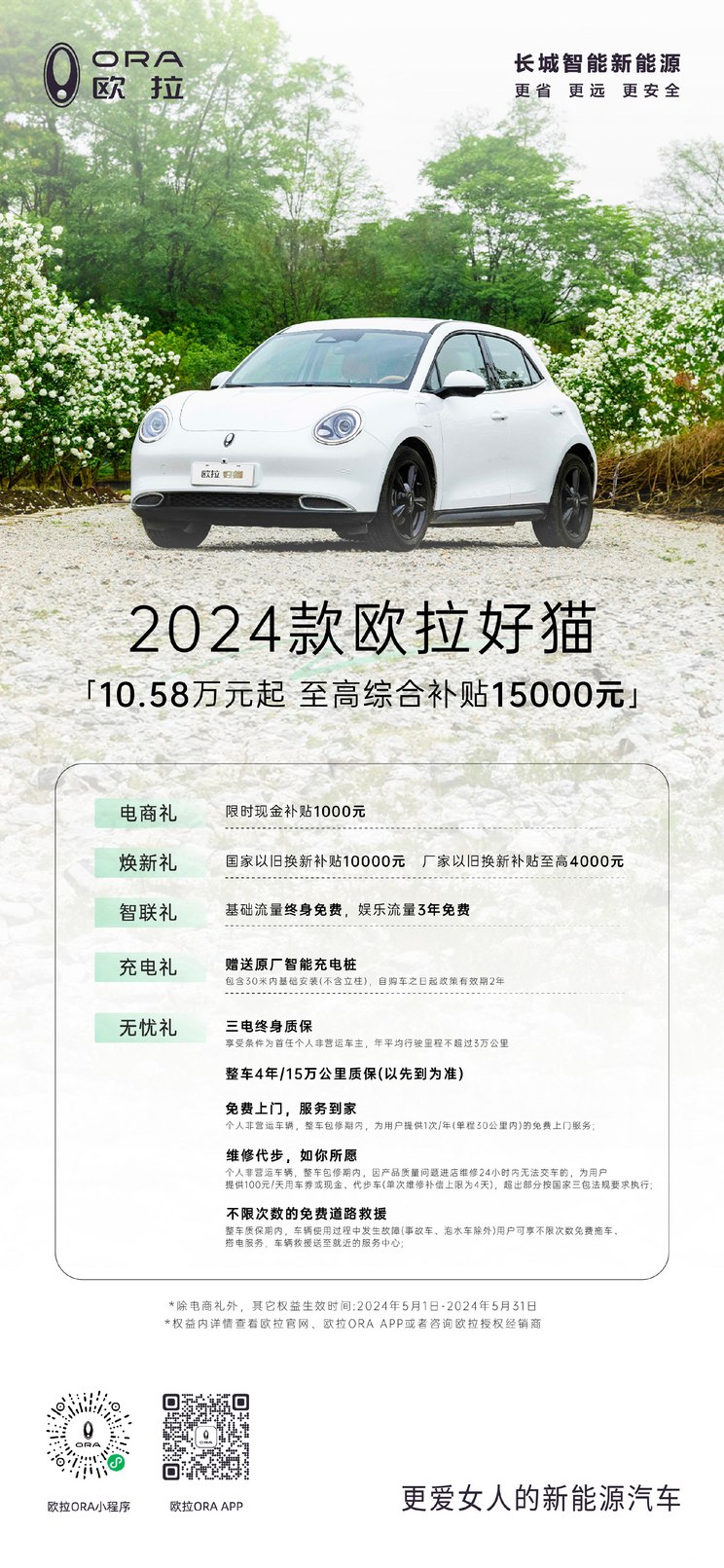 [本站 资讯] 5月9日,我们从官方了解到,欧拉汽车针对旗下2024款好猫、2024款好猫GT木兰版、芭蕾猫、闪电猫推出限时优惠政策,具体如下: