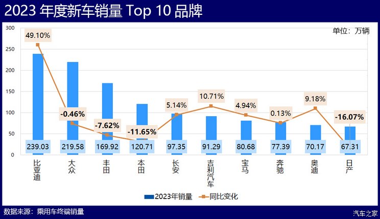 [本站 快评] 如果让你说出2023年在华销量排名前三的车企都是谁,不知道您会不会脱口而出。数据来看,比亚迪、大众和丰田位列前三,其后是本田、长安、吉利和宝马。能够看到,虽然互联网新生代造车力量不断涌入,大家的关注点更多转向了“蔚小理”、华为以及小米等企业,但其实在终端市场上,不少传统车企的份额依然非常可观。