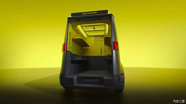雷诺Estafette概念车采用双侧滑门开启方式。车身后半部为封闭式货厢,尾部则装配有大尺寸的卷帘门,以方便货物进出。据官方称,该车长度为4870mm,高度为2590mm,并拥有7.1立方米的载货空间。