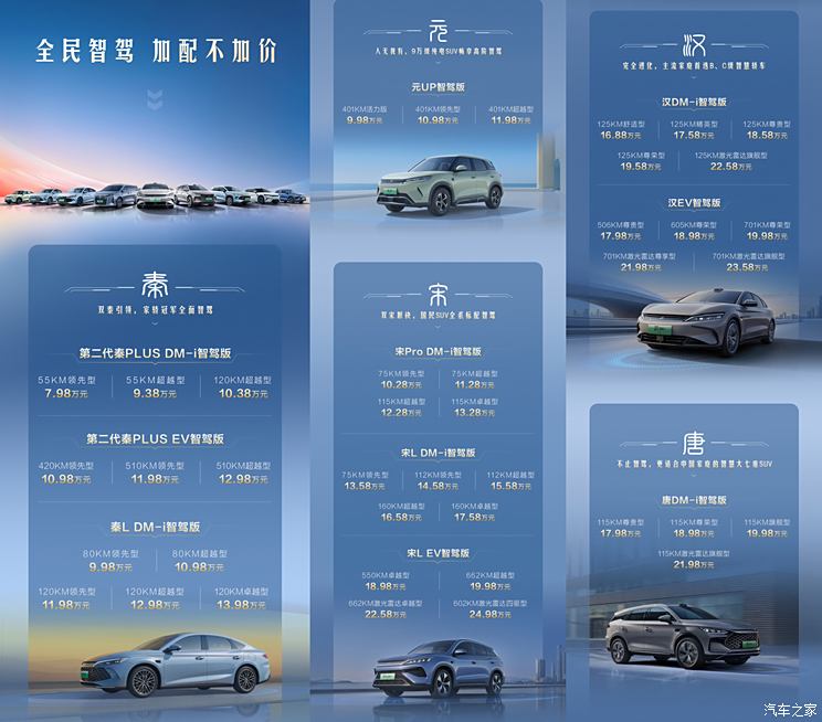 2月10日,比亚迪旗下共计20款车系完成上市,这21款车系均搭载天神之眼智驾。由于车型过多,其整体售价区间为6.98-24.98万元。相比于过去,此次的核心重点是新车将会拥有高速路、快速路领航的高级智驾,同时,升级智驾之后,比亚迪搭载智驾功能的车型覆盖面将更广,入门车型也将配备智驾。关于不同车型,详情请见下图: