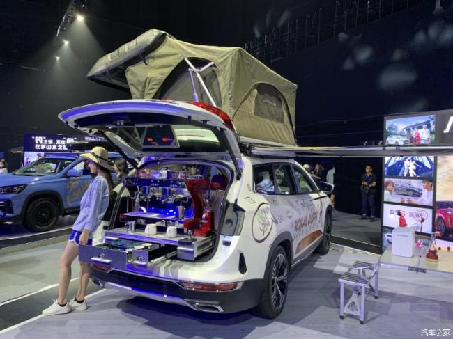 新车内部通的改装,通过折叠第二排座椅后的纯平后备厢空间进行打造,布置有一张双人充气床垫,并在车顶设计有折叠式娱乐屏幕,便于车内露宿。此外在后备厢内还隐藏了厨具套装,包含电磁炉、水池在内的多个组件,能够让用户在露营的同时,还能改享受美食。