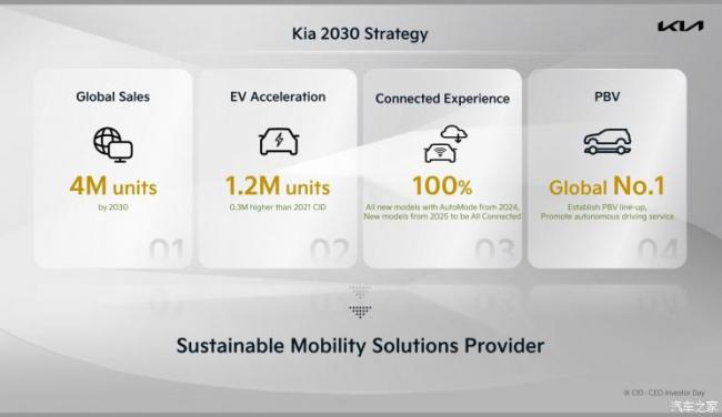 [本站 资讯] 日前,起亚发布2030战略规划,宣布将致力于成为可持续移动出行领域的全球领导品牌。起亚还公布了2030年四大核心业务目标,包括:加快推进电动化,2030年纯电动汽车年销量达到120万辆;2030年全球汽车产品销量达400万辆,其中新能源车型超200万辆;所有新车均配备智能互联系统和自动驾驶辅助技术;2030年成为全球PBV(个性化定制车型)市场第一品牌。
