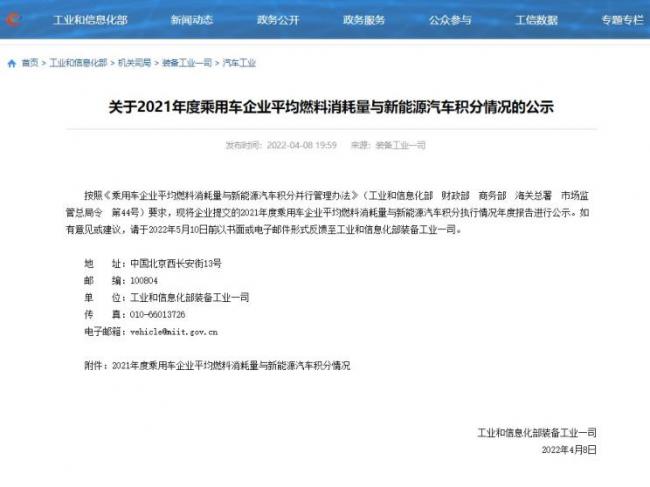 [本站 资讯] 按照《乘用车企业平均燃料消耗量与新能源汽车积分并行管理办法》(工业和信息化部 财政部 商务部 海关总署 市场监管总局令 第44号)要求,现将企业提交的2021年度乘用车企业平均燃料消耗量与新能源汽车积分执行情况年度报告进行公示。
