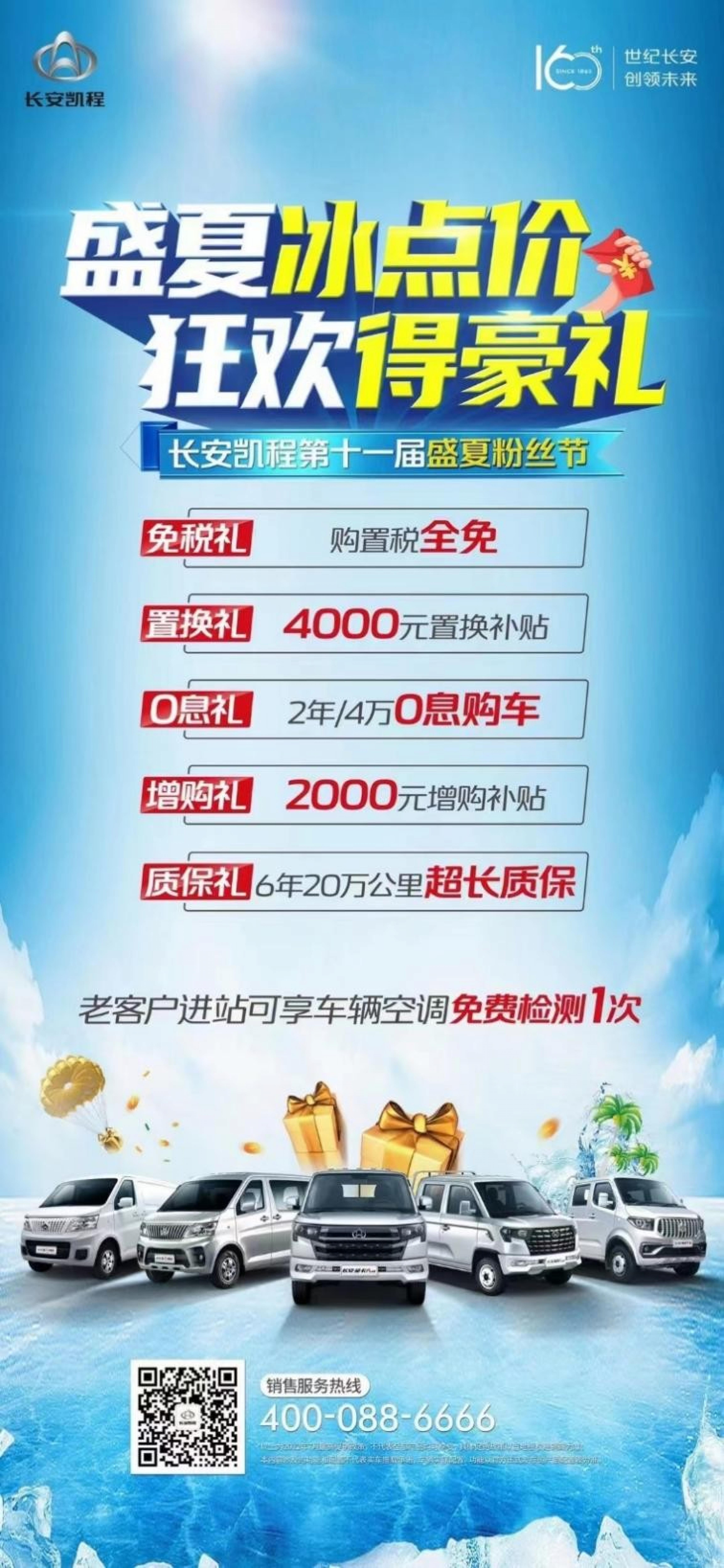 除了在产品源头帮用户省钱,长安凯程更在盛夏时节如约开启第十一届粉丝节,全系车型开启促销优惠,盛夏购车冰点价,实实在在让利用户,现在下单即得6大豪礼,具体为: