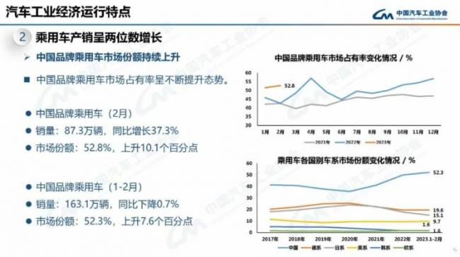 [本站 资讯] 日前,中汽协公布了2月份国内汽车市场的产销数据。2023年2月,因去年同期及今年1月均为春节月,基数相对较低,汽车产销环比、同比均呈明显增长。其中,乘用车产销呈两位数增长,商用车产销环比同比均呈两位数增长,新能源汽车和汽车出口延续良好表现。
