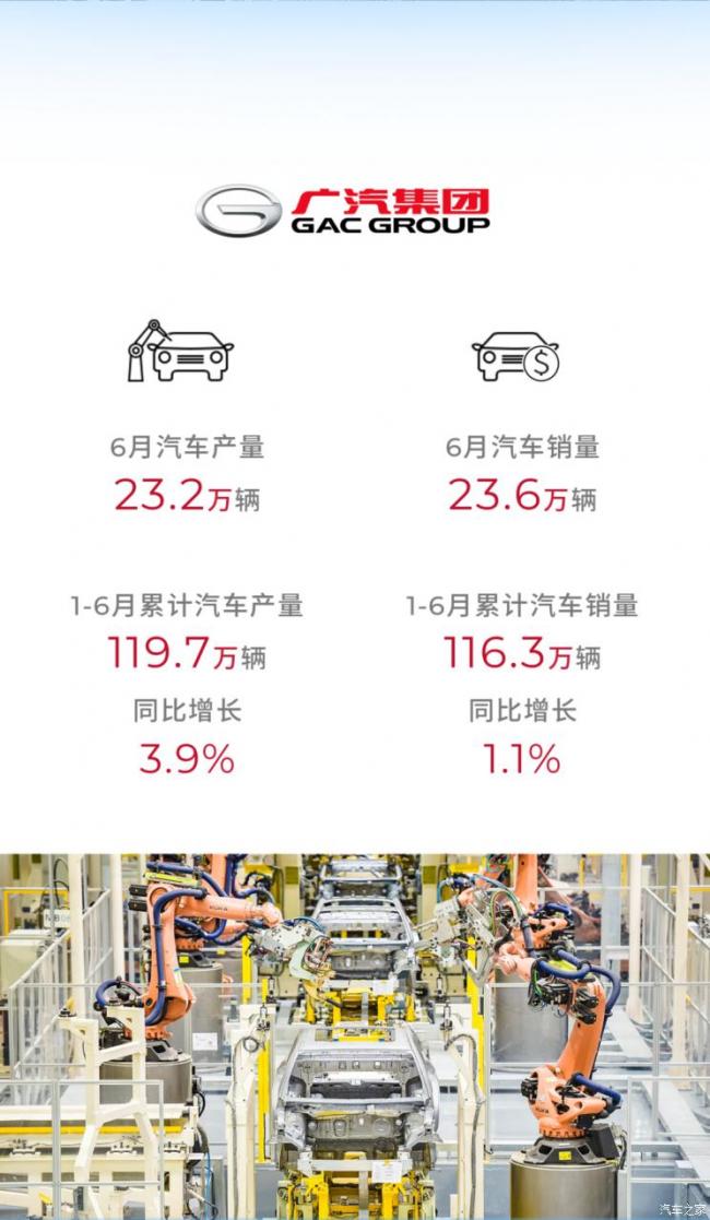 [本站 资讯] 近日,广汽集团公布了其2023年6月的产销数据。6月汽车产量23.2万辆,6月汽车销量23.6万辆。1-6月累计汽车产量119.7万辆,同比增长3.9%。1-6月累计汽车销量116.3万辆,同比增长1.1%。