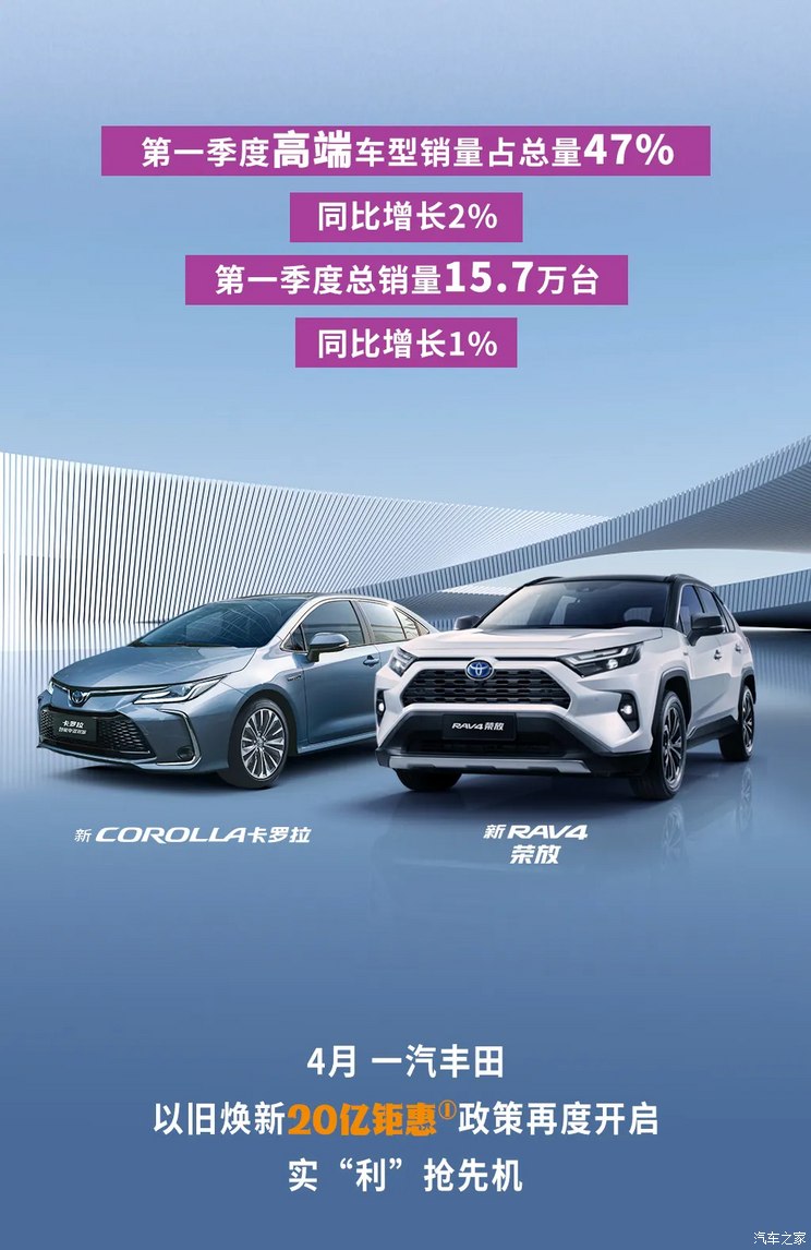 [本站 资讯] 4月12日,我们从官方获悉,一汽丰田三月销量为58031台,电动化车型销量26743台,占比46%。第一季度一汽丰田总销量15.7万台,同比增长1%。此外,4月一汽丰田“以旧焕新”活动已经开启,活动时间为2024年4月1日-4月30日。具体信息如下:
