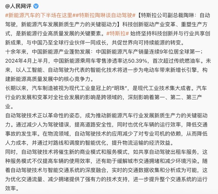 就在马斯克来华的前两天,人民网评发布了关于特斯拉副总裁陶琳的专访,题目为“陶琳:自动驾驶,新能源汽车发展新质生产力的关键驱动力”。文章提到,“自动驾驶技术正以革命性的姿态,成为推动新能源汽车行业发展新质生产力的关键驱动力。”该文章大篇幅的介绍了特斯拉自动驾驶的优势,以及将带来的新商业模式。