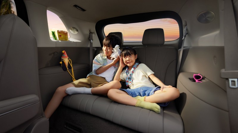 其次,在多乘员出行时,这套“屏幕矩阵”也展现出更多实用性——副驾10.25英寸专属屏和第二排17.3英寸娱乐屏拥有“下车卫士”功能,在乘客下车前自动显示车门外侧盲区,避免“开门杀”。