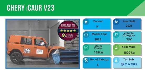 12月26日,东盟新车安全评鉴协会(ASEAN NCAP)公布了最新一轮新车测试结果,iCAR V23(海外名称:iCAUR V23)以91.02的综合得分斩获最高五星安全评级,成为获得ASEAN NCAP认证的首款“五星方盒子”车型。