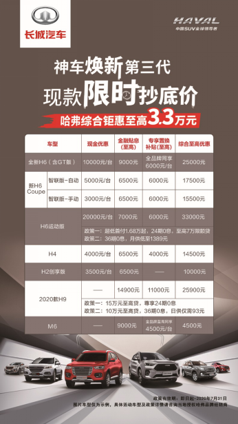 对于现阶段的各大车企来说,汽车智能科技领域“神仙打架”的局面已经形成,避无可避,谁能在此领域占得先机,谁就拥有强势崛起的先决条件。而通过上述分析我们可以看出,哈弗H6无疑已经取得领先地位,无愧于“国民神车”的称号。除此之外,现在参与哈弗H6“神车焕新第三代 现款限时抄底价”活动,购全新哈弗H6、新哈弗H6 Coupe 、哈弗H6运动版均有优惠,且综合钜惠至高达33000元。此外,通过电商平台购车还可享电商政策,消费者在电商平台支付9.9元,即可享受至高2000元(全新哈弗H6、新哈弗H6 Coupe)和至高1000元(哈弗H6运动版)的购车优惠。如此神车再加如此优惠,现在不入手更待何时?