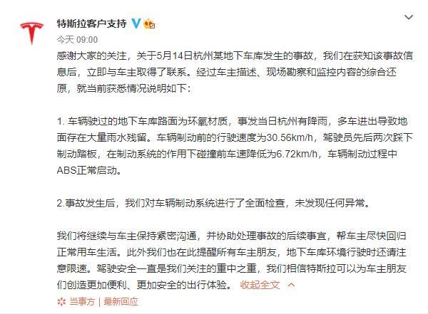 [本站 资讯] 近日,据多家媒体报道,在杭州某地库一辆特斯拉Model 3因疑似刹车失灵而撞向墙壁,造成车辆前包围损坏。目前,经过杭州特斯拉西溪服务中心对车辆进行检测,以及对事发地进行勘察,现做出如下回应: